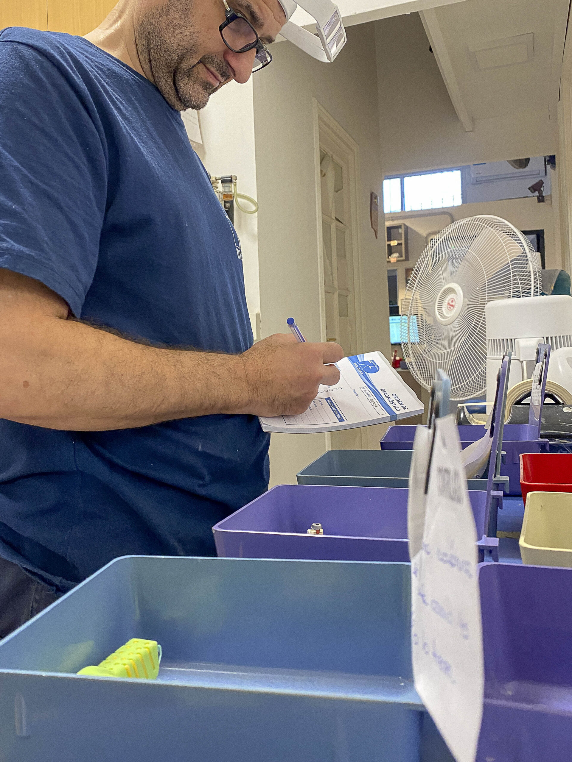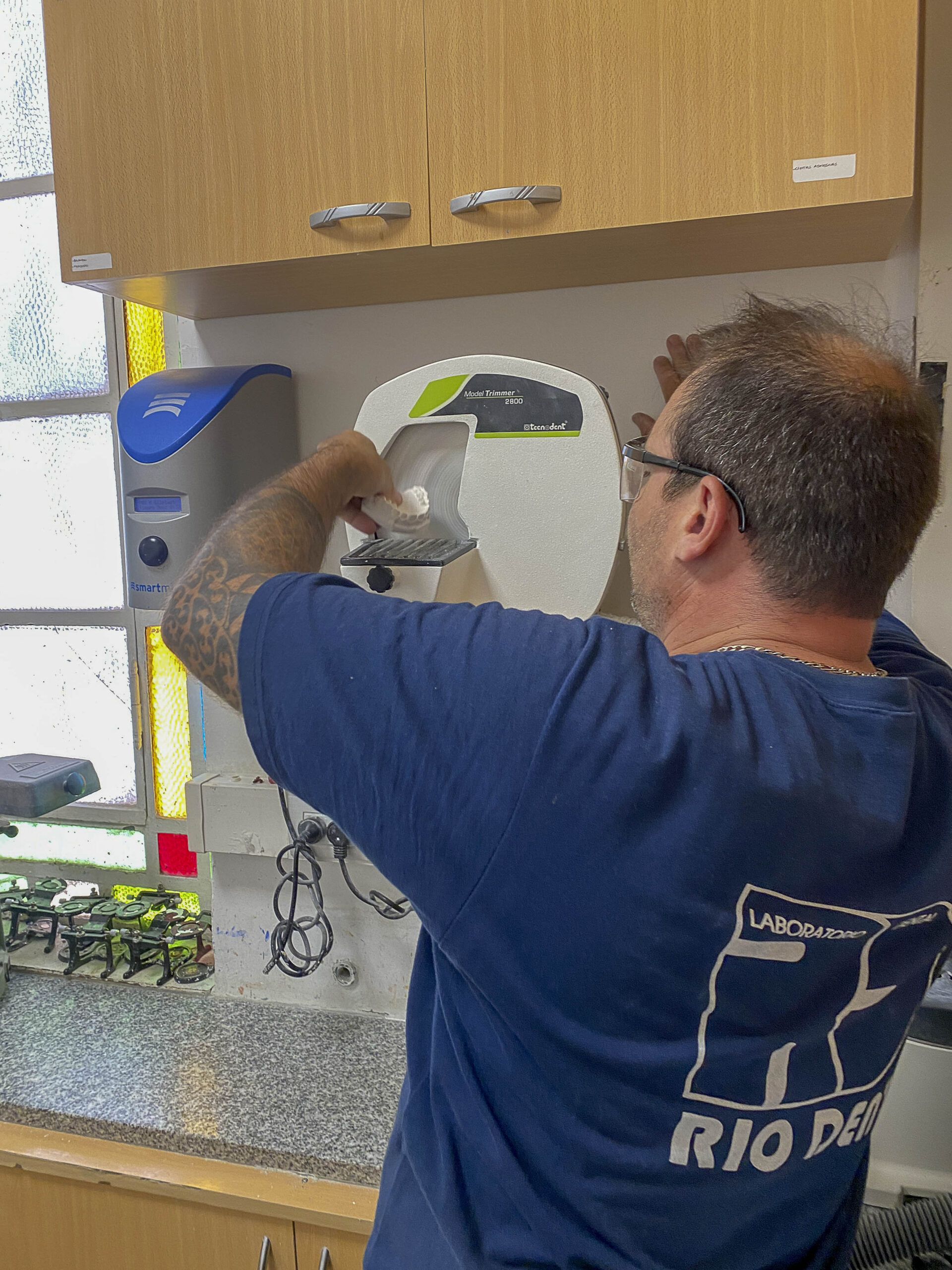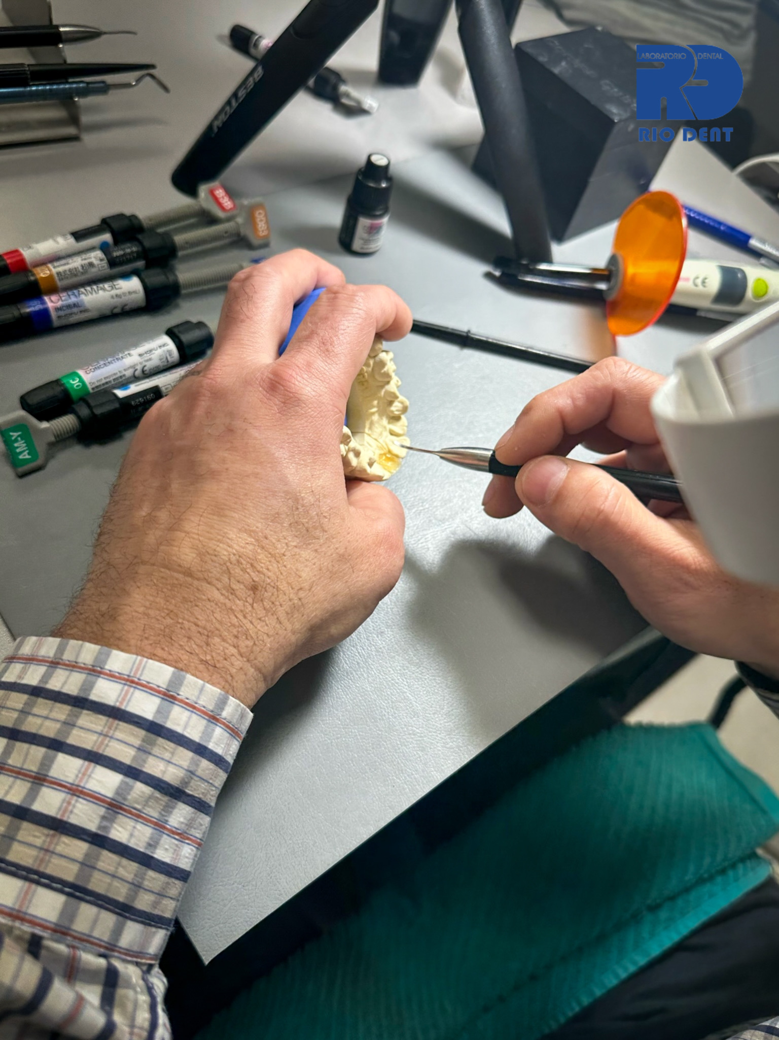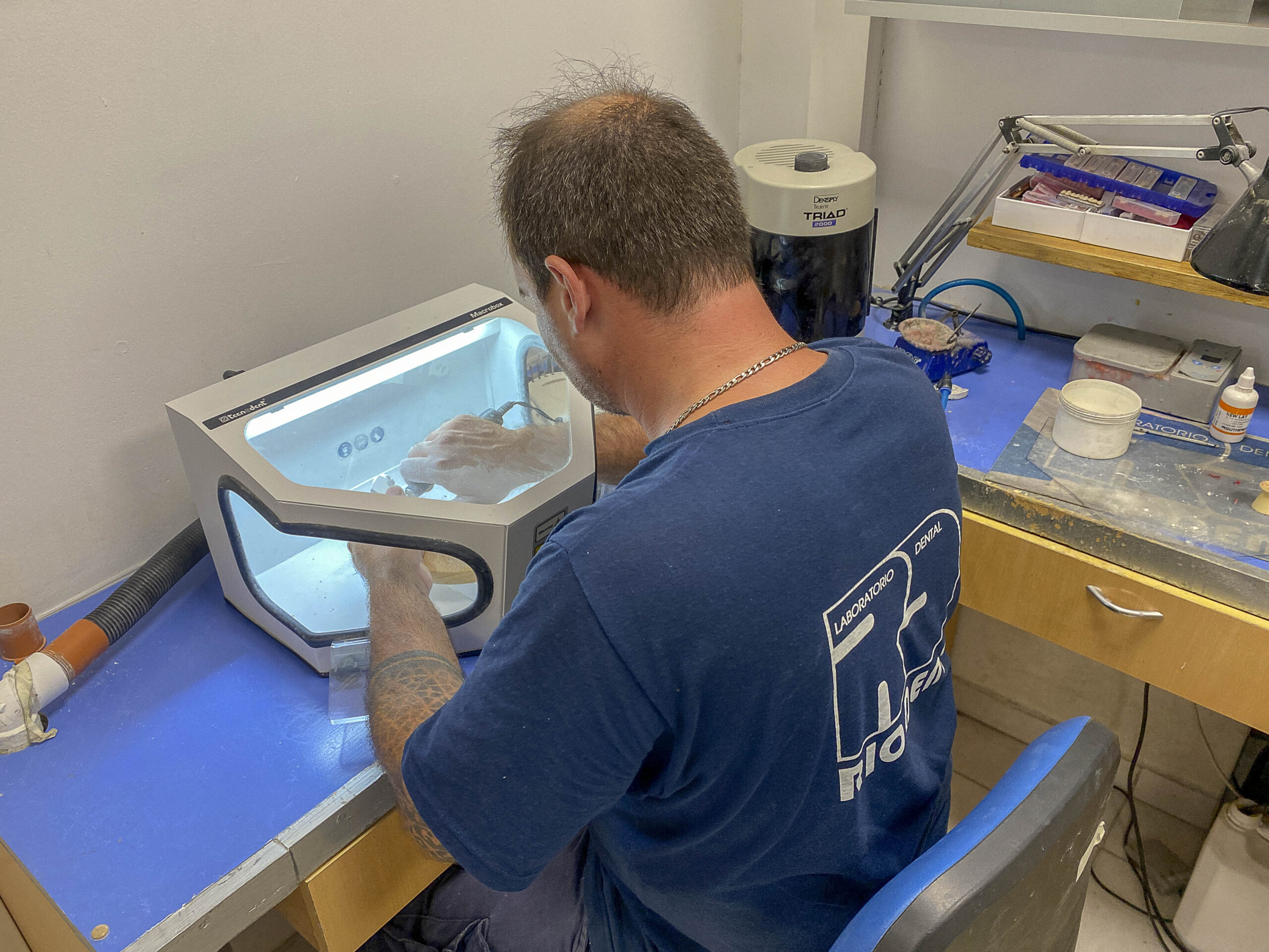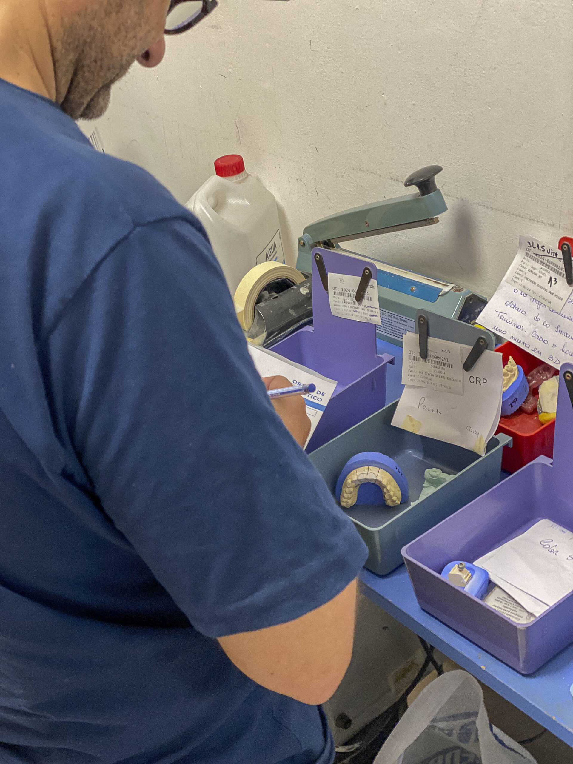 Aquí llegan los trabajos para ser descontaminados, controlados y catalogados para enviarlos a los sectores acordes. En la parte de Yeso se realizan los vaciados (mezcladora al vacío) y la preparación de los modelos para fija y/o removible (perforadora de dowell y recortadora). Se montan los oclusores y articuladores. También se realizan los estampados para vacupress, contención y protectores bucales. Se elaboran los troquelados, revestimientos. Se trabajan los muflados y descerados.
